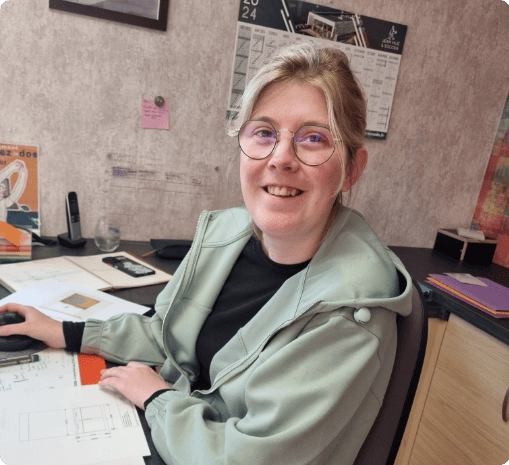 Tiphaine gère la réception des livraisons et la mise en œuvre des projets jusqu’à la pose. Elle contribue à la réflexion collective sur les projets nécessitant une méthodologie.