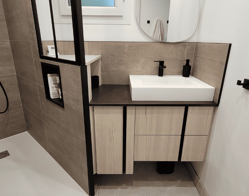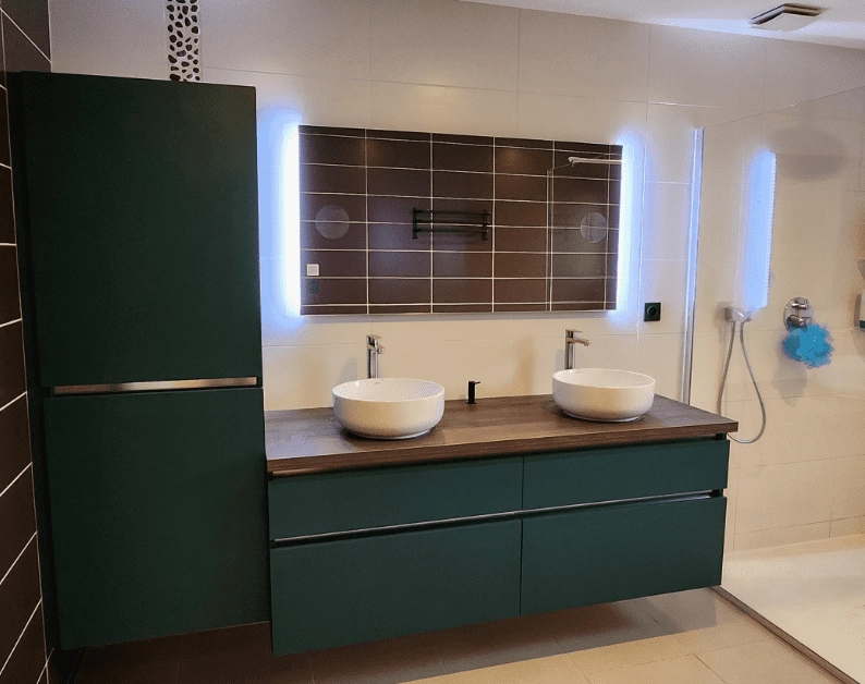 Imaginez votre salle de bain en un véritable havre de paix avec nos solutions sur mesure. Que vous rêviez d’un design original, d’un style classique intemporel, ou d’une ambiance zen et naturelle, nous vous accompagnons dans la conception de votre salle de bain idéale. Nous proposons un large choix de matériaux haut de gamme pour créer une atmosphère unique et personnaliser chaque détail de votre salle de bain : vasques, tiroirs de rangement, miroirs, éclairages LED pour une ambiance parfaite. Profitez des dernières technologies avec des systèmes anti-buée, des loupes intégrées et même des options Bluetooth pour une expérience améliorée.